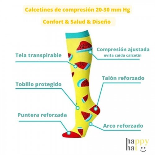 Calcetines compresivos cómodos y divertidos que ayudan a tus piernas a descansar. Certificación de compresión entre 20 y 30 mm Hg.