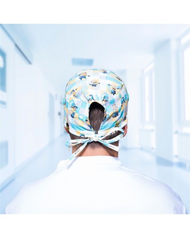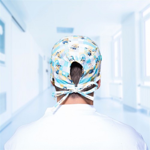 Gorro quirófano pelo corto los Minions en cuadros que te encantará. Un modelo fabricado en España. Buscamos los mejores diseños, las mejores telas para tus gorros Happy Hat.