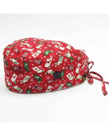Divertido gorro quirófano pelo corto con estampado de calcetines de Navidad. Color rojo.