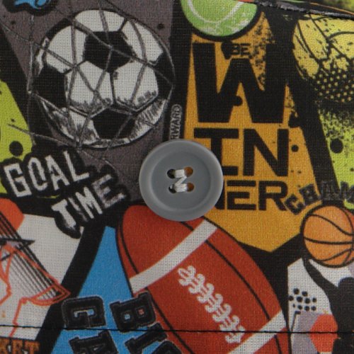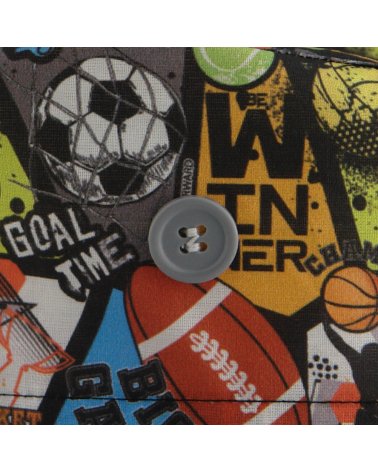 Estampado divertido con balones y escudos de diferentes deportes.