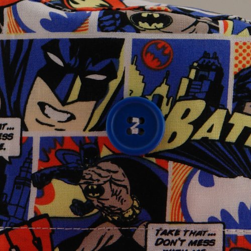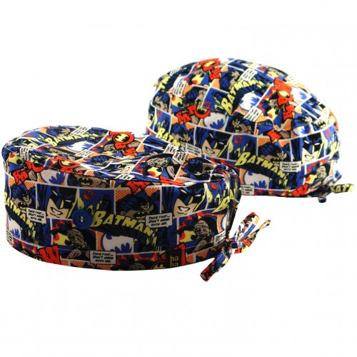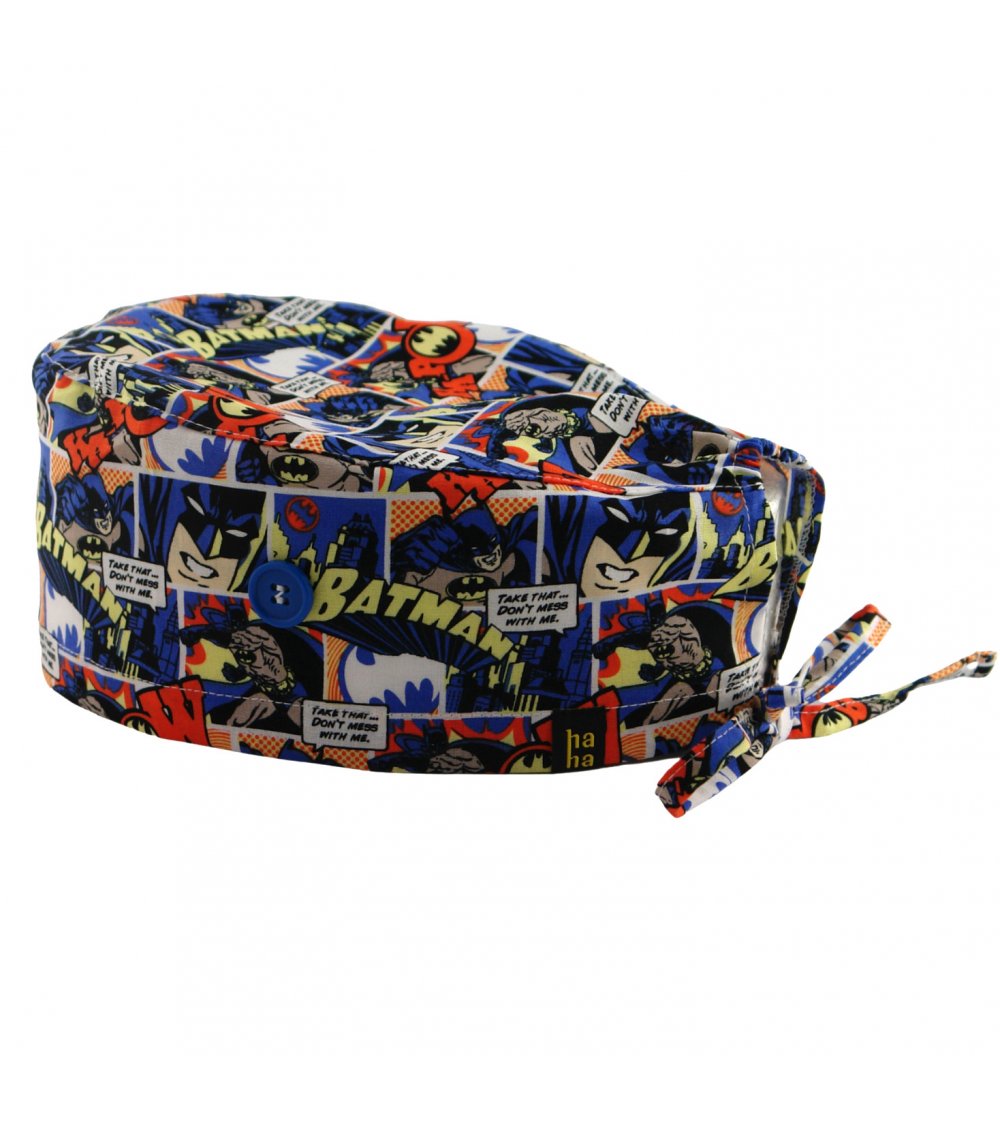 Gorro quirofano Batman morado: gorro quirófano pelo corto con viñetas retro y aire nocturno, inspirado en Batman. Morado con actitud para guardias largas. Algodón 100% con botones para mascarilla y ajuste cómodo.