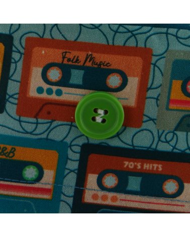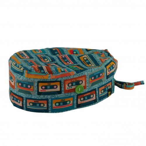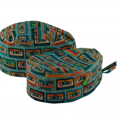 Gorro quirofano OCHENTAS: gorro quirófano pelo corto con estampado de cassettes vintage para tu “walkie-talkie” más molón. Algodón 100% transpirable, con botones para mascarilla: puro rollo 80s para médicos y enfermeras.