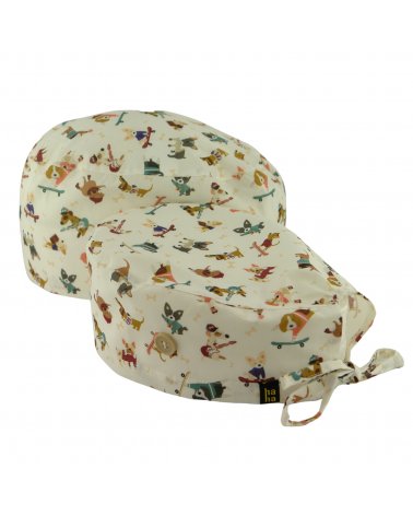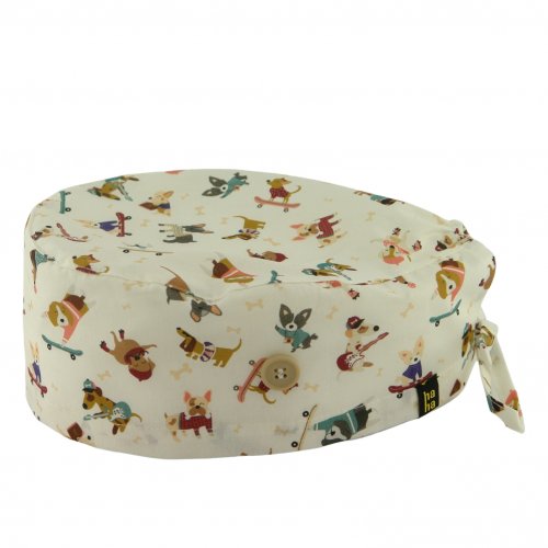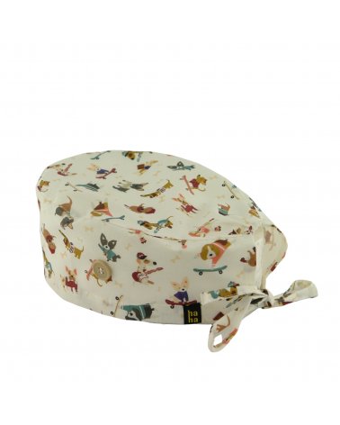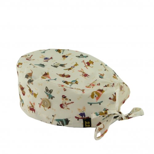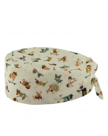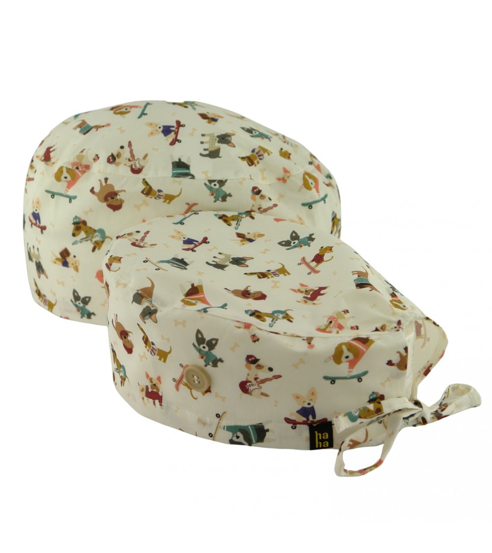 Gorro quirófano PERRO LOVERS: gorro quirófano pelo corto de algodón 100% con fondo blanco y perritos divertidos. Transpirable, suave y con botones para mascarilla: ideal para médicos y enfermeras amantes de los perros.