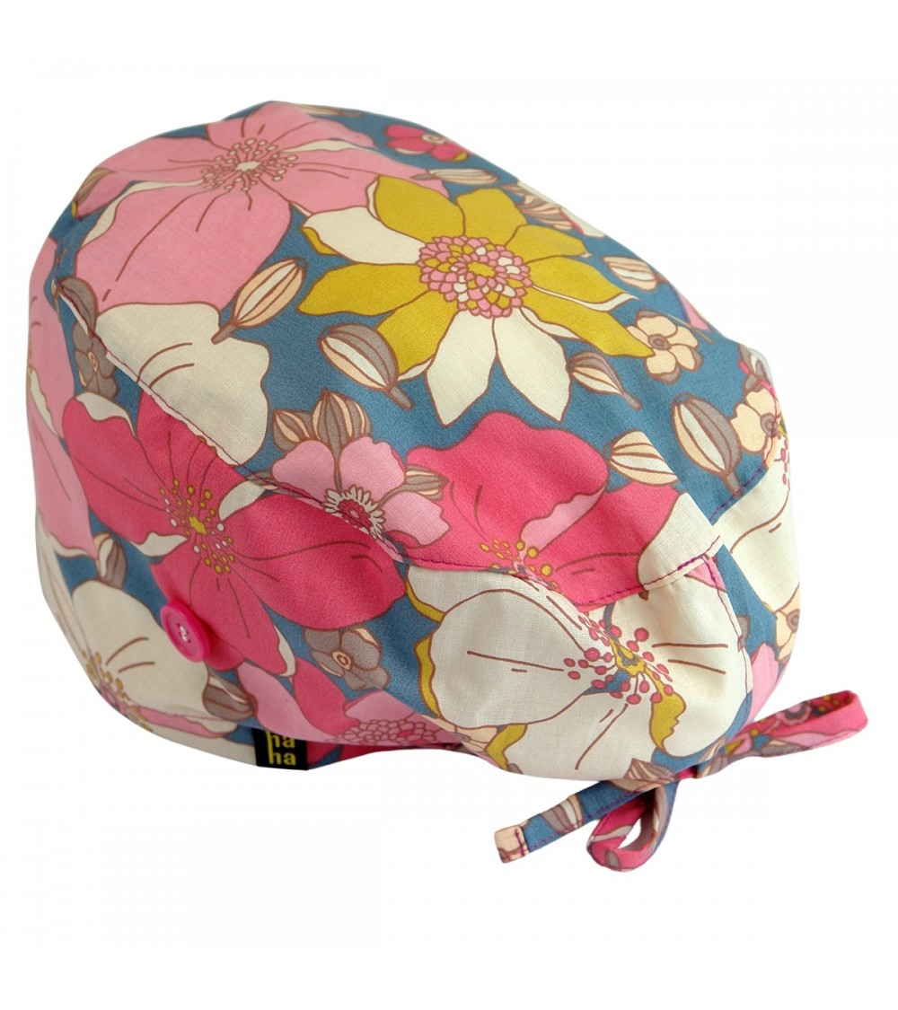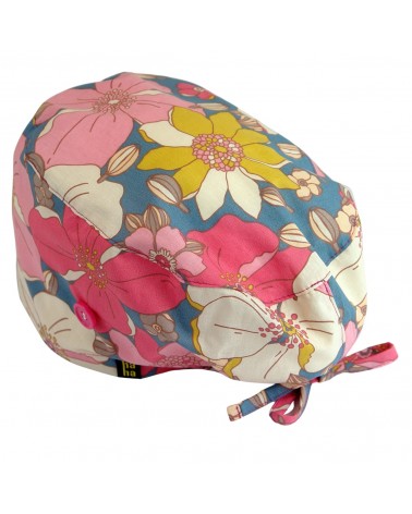 Elegante gorro quirófano con Flores tropicales en color rosa para pelo largo.