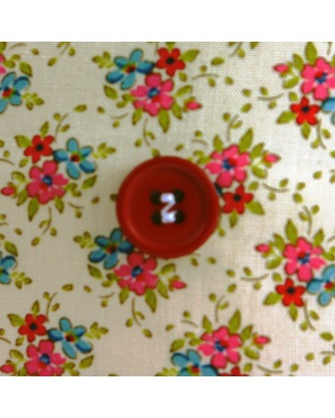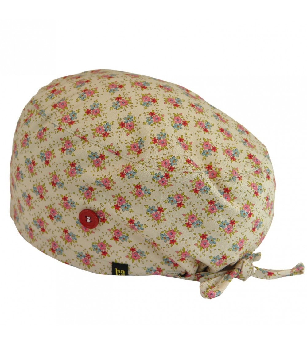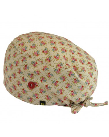 Elegante gorro quirófano pelo largo con diseño de ramilletes de flores en rosa y azul con fondo en beige.