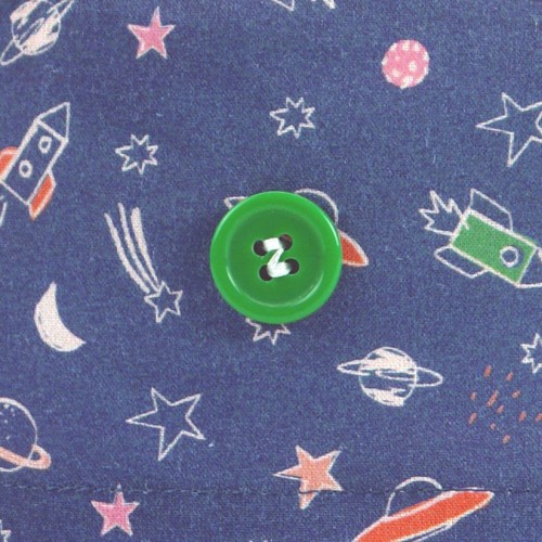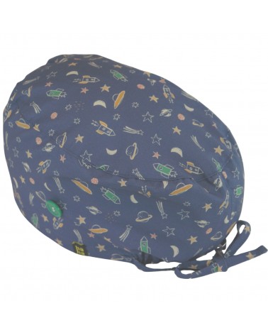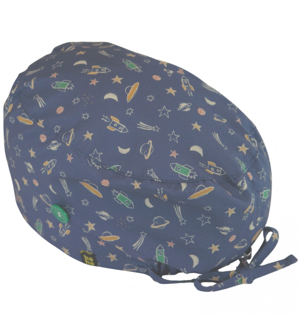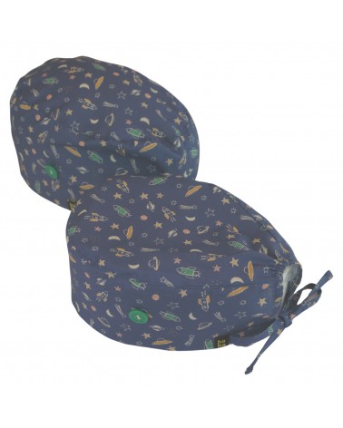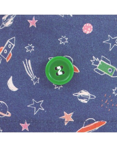 Estampado con motivos de planetas ,satélites y cometas en un fondo azul marino. Incluye botones laterales para tu mascarilla.