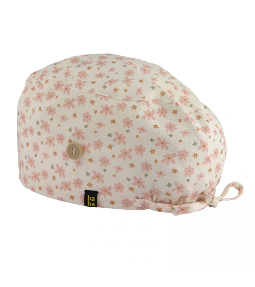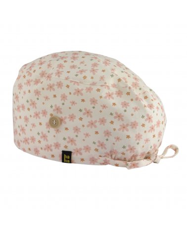Gorro sanitario de flores en color rosa y blanco. Para médicos y enfermeras con pelo largo que quieren marcar la diferencia con un gorro elegante y bonito.