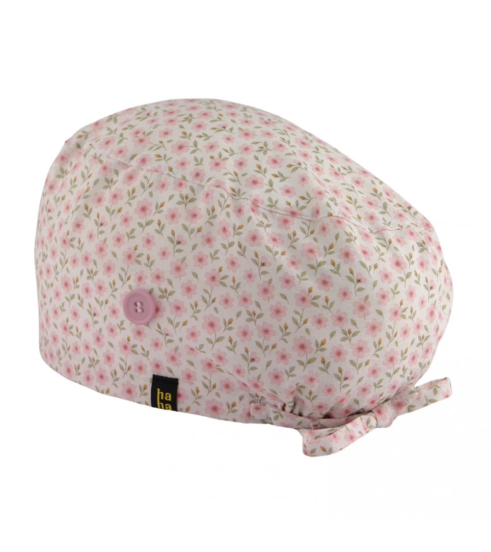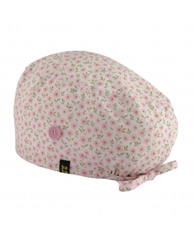 Gorro sanitario con estampado de Flores en color Rosa y fondo blanco. Ideal sanitarios que quieran marcar la diferencia con un gorro elegante y bonito.