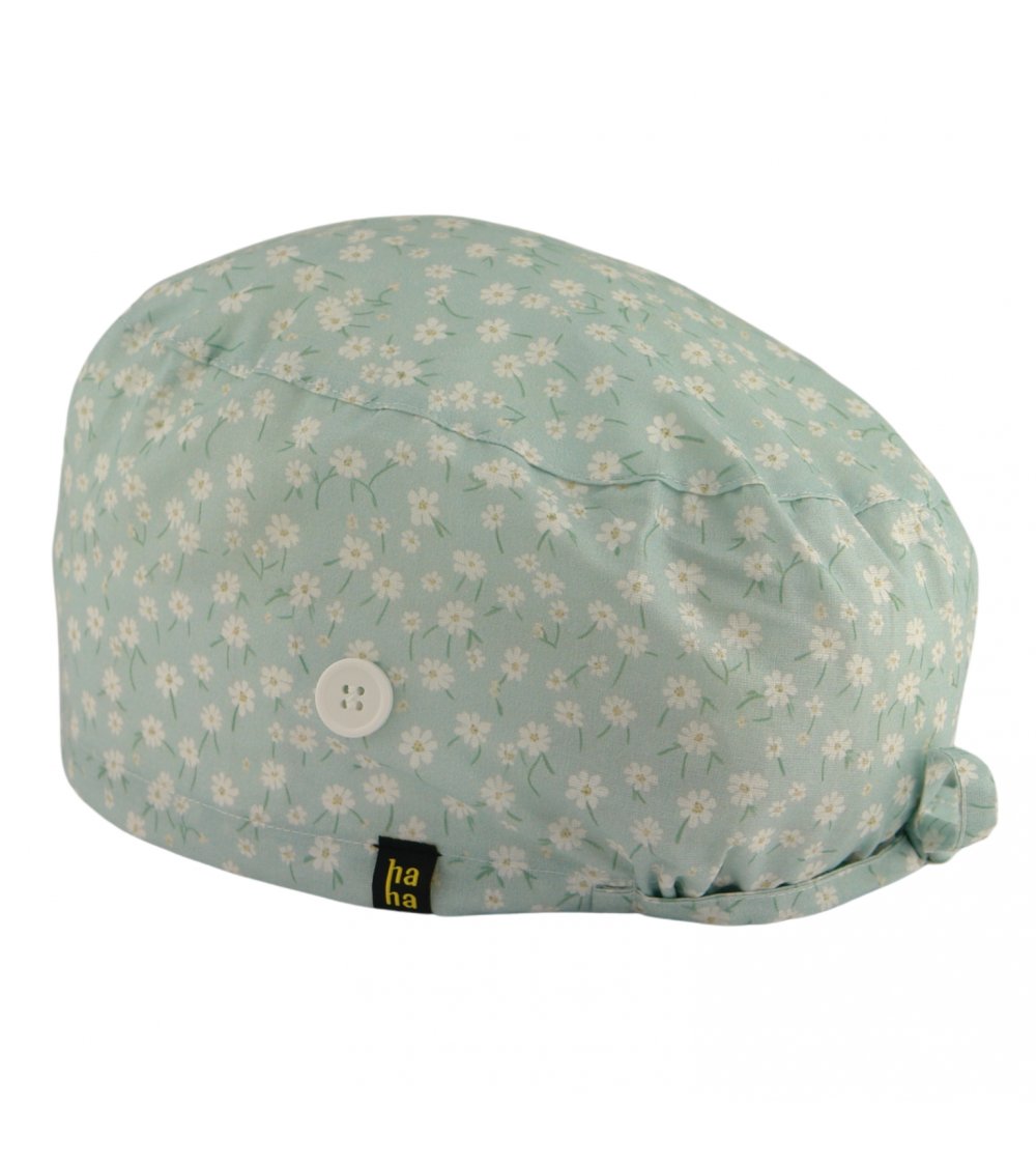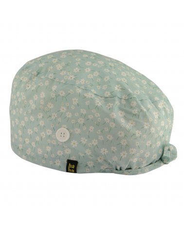 Gorro sanitario con estampado de Margaritas en blanco con fondo en color verde mint. Un gorro elegante y original para sanitarios que hacen la diferencia.