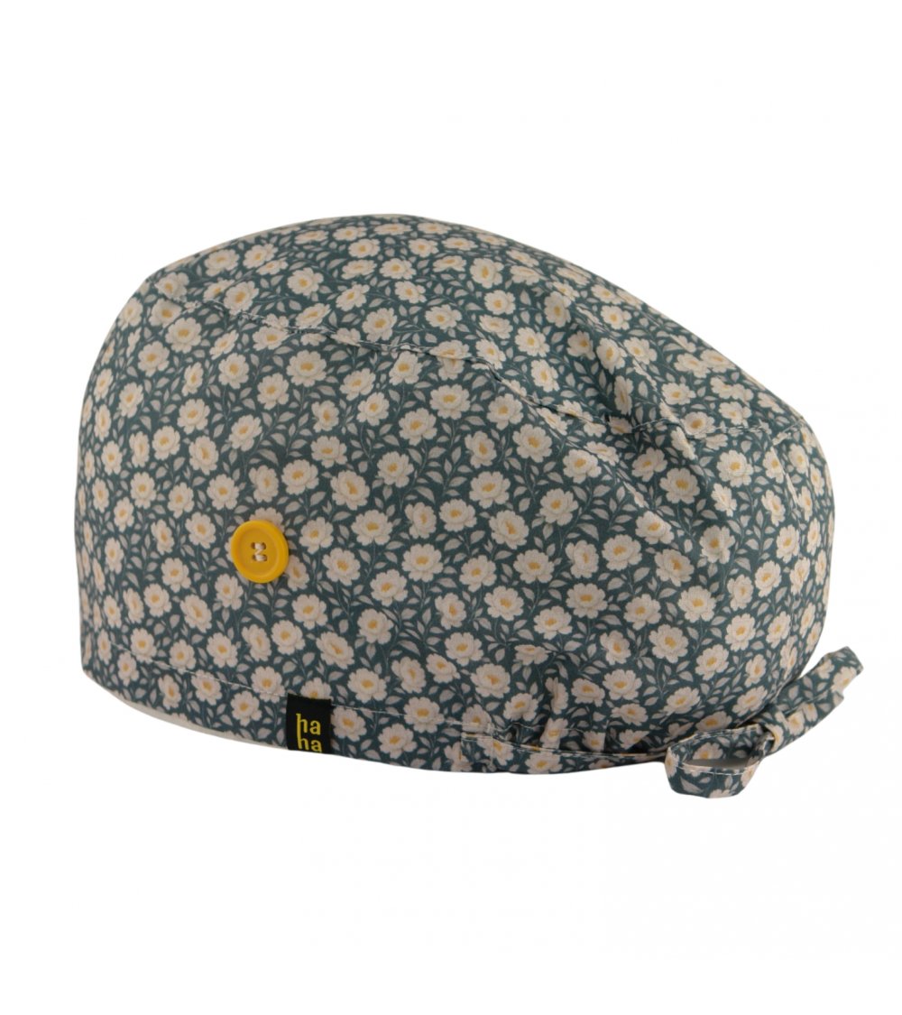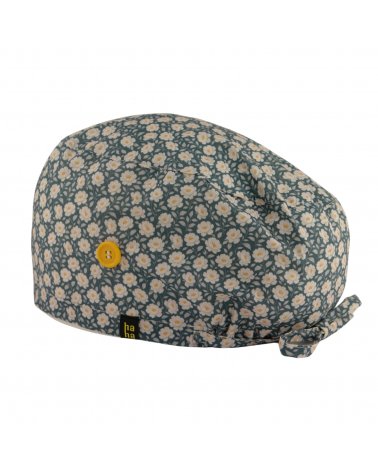 Gorro sanitario con estampado de flor blanca y fondo azul oscuro, margaritas. Ideal para sanitarios que marcan la diferencia con un toque distintivo y elegante.
