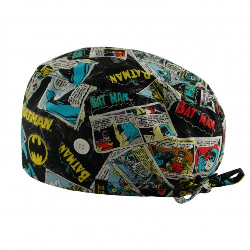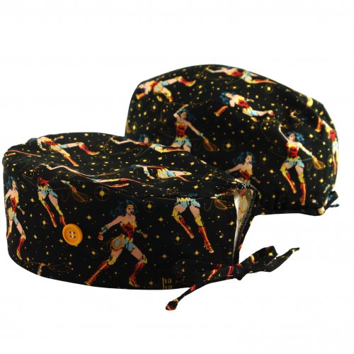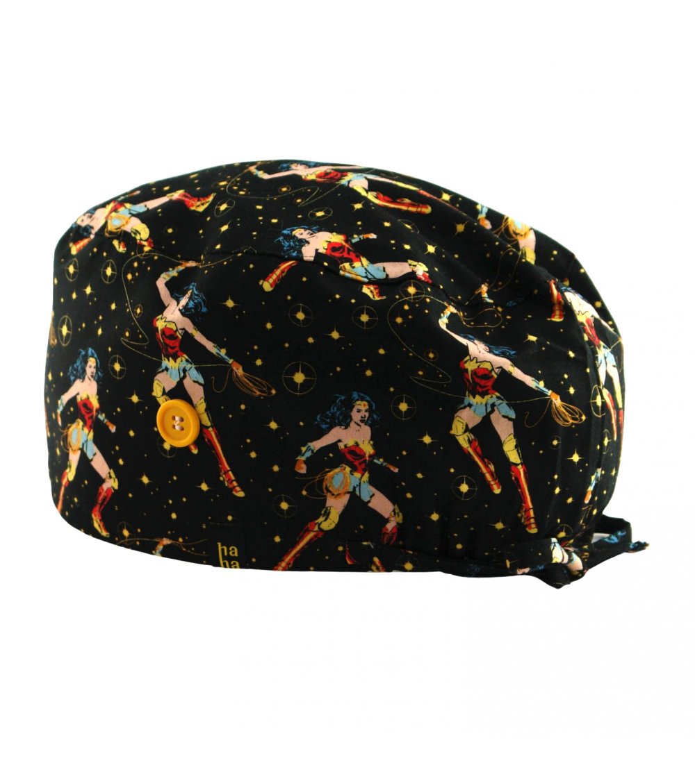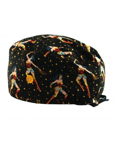 Gorro hospital superwoman negro: gorro quirófano pelo largo en fondo negro con imágenes de Superwoman. Potente, elegante y con aire cómic retro. Algodón 100% transpirable con botones para mascarilla y ajuste cómodo.