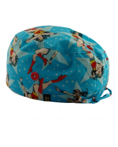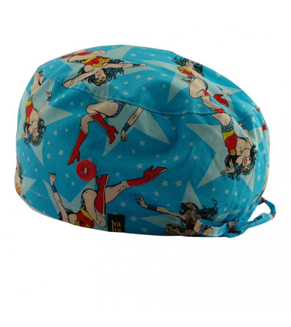 Gorro hospital superwoman azul: gorro quirófano pelo largo con fondo azul cielo intenso e imágenes de Superwoman. Diseño cómic para heroínas del hospital. Algodón 100% con botones para mascarilla y ajuste cómodo.