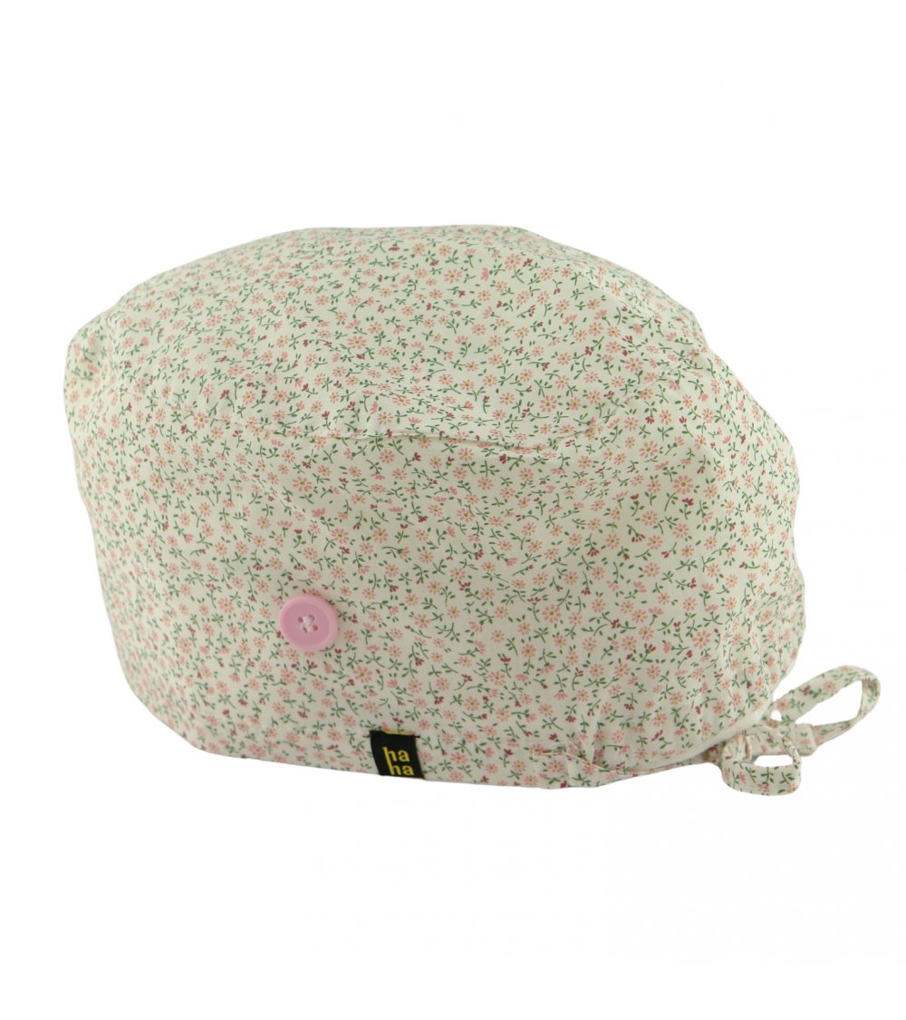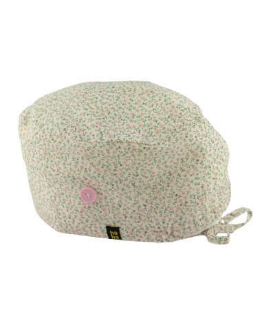 Gorro hospital BEAUTY: gorro quirófano pelo largo con pequeñas florecitas en tonos dulces. Un diseño delicado y bonito, en algodón 100% con botones para mascarilla, ideal para médicos y enfermeras.