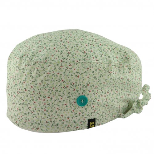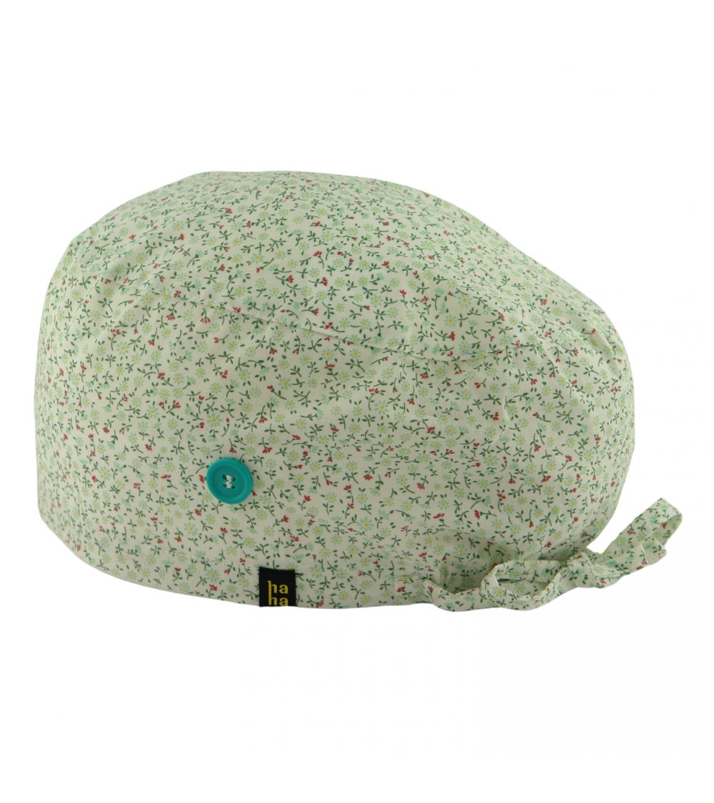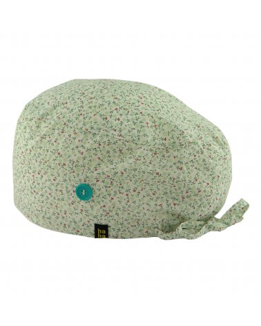 Gorro hospital BESO FLORAL: gorro quirófano pelo largo con florecitas pequeñas en tonos rosa y verde mint. Dulce, elegante y muy HappyHat. Algodón 100% transpirable, con botones para mascarilla y ajuste cómodo para turnos largos.