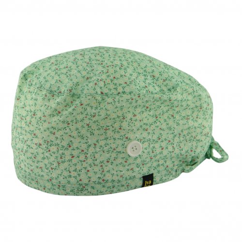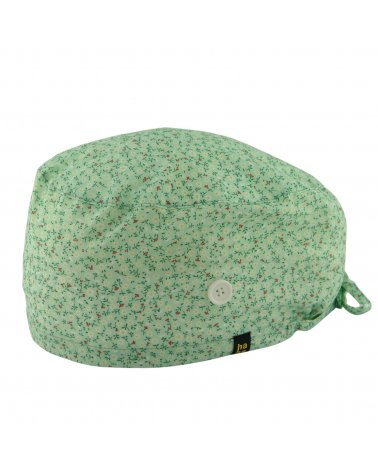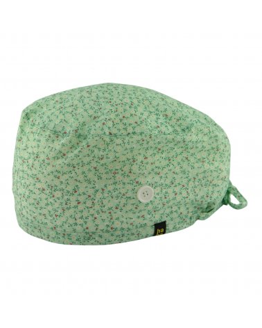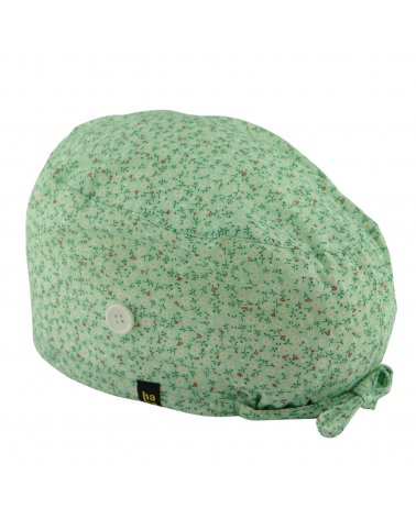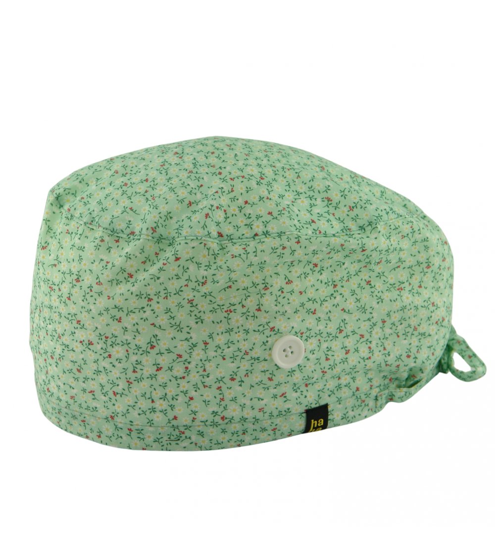 Gorro hospital DULCE VERDE: gorro quirófano pelo largo en verde mint con florecitas liberty: elegante, dulce y muy “clinic chic”. Algodón 100% transpirable y botones para mascarilla: perfecto para tus días en el hospital.