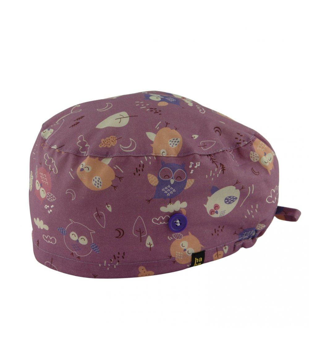 Gorro hospital NOCHE FELIZ: gorro quirófano pelo largo en morado, con búhos y animalitos nocturnos para acompañarte en guardias largas. Suave, ligero y con botones para mascarilla. HappyHat para noches intensas.