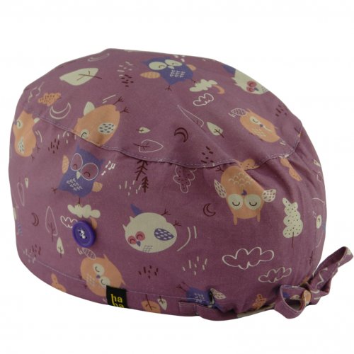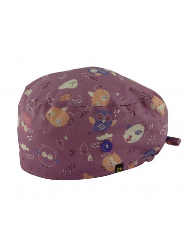 Gorro hospital NOCHE FELIZ: gorro sanitario de pelo largo en morado con búhos. Diseñado para jornadas largas en quirófano, hospital o clínica.