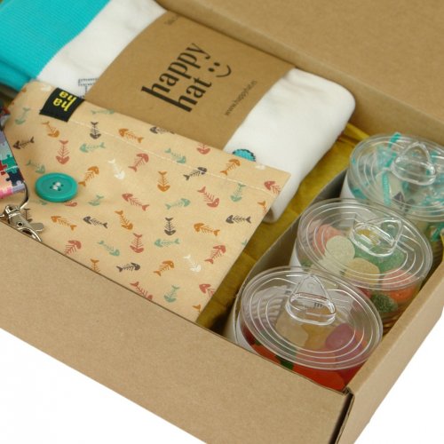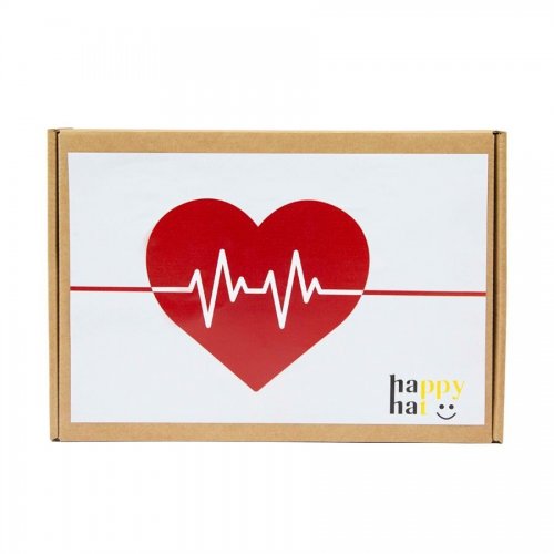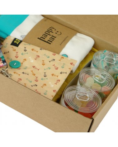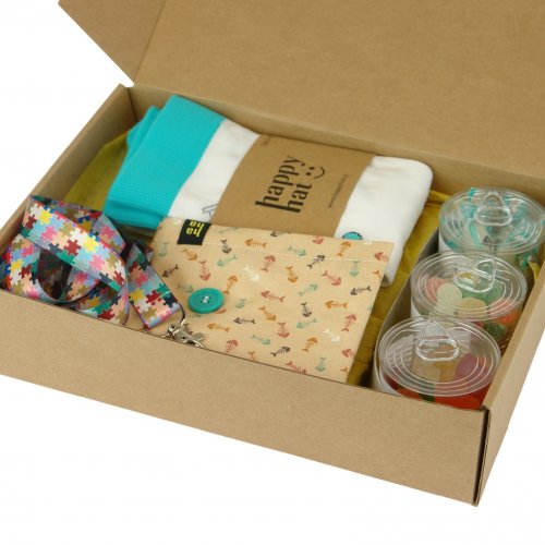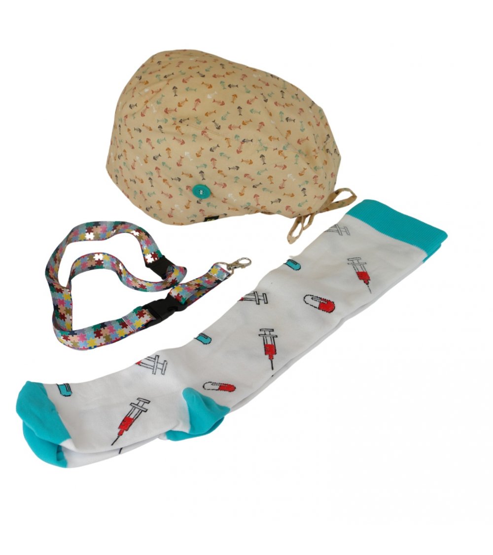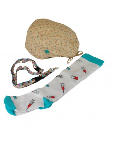 - Caja de regalo con un gorro quirurjico, unos calcetines de compresión, un lanyard y tres botes de golosinas con frases animadas.