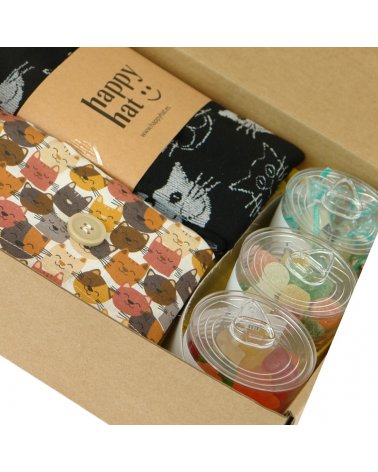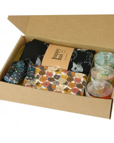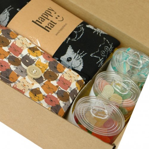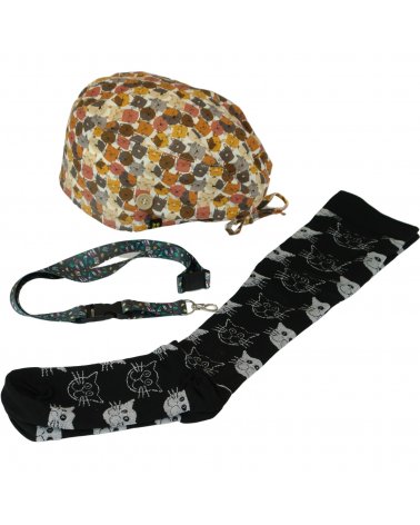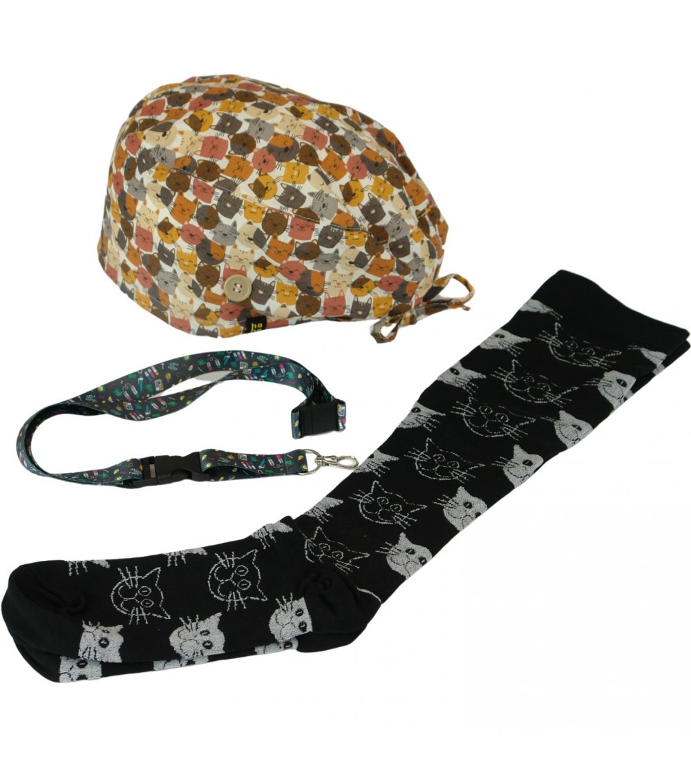 - Caja de regalo con un gorro quirurjico, unos calcetines de compresión, un lanyard y tres botes de golosinas con frases animadas.