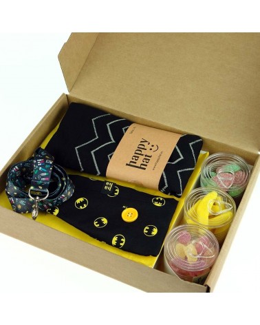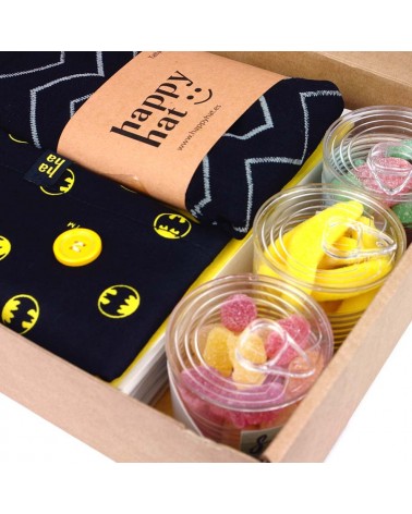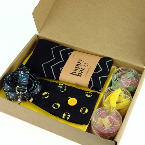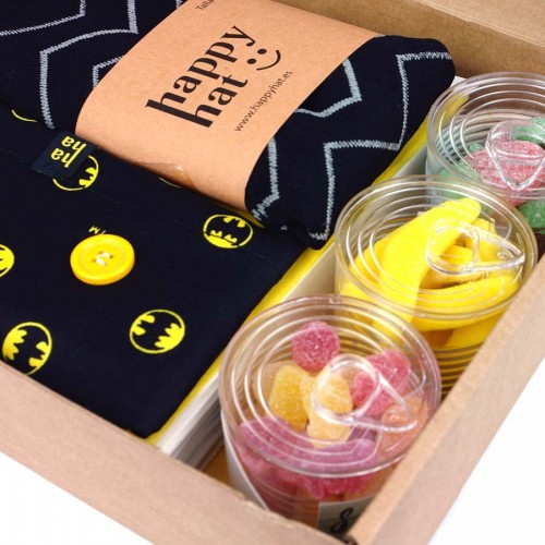 - Caja de regalo con un gorro quirurjico, unos calcetines de compresión, un lanyard y tres botes de golosinas con frases animadas.