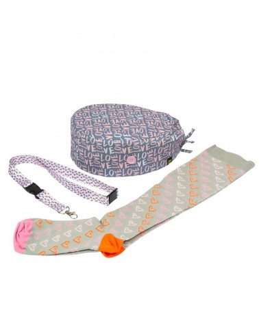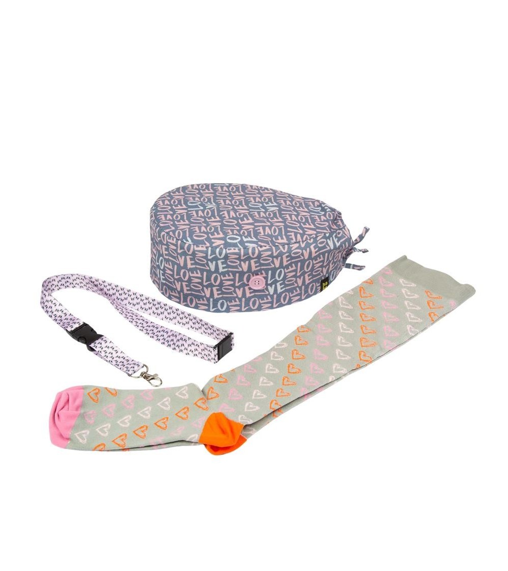 - Caja de regalo con un gorro quirurjico, unos calcetines de compresión, un lanyard y tres botes de golosinas con frases animadas.